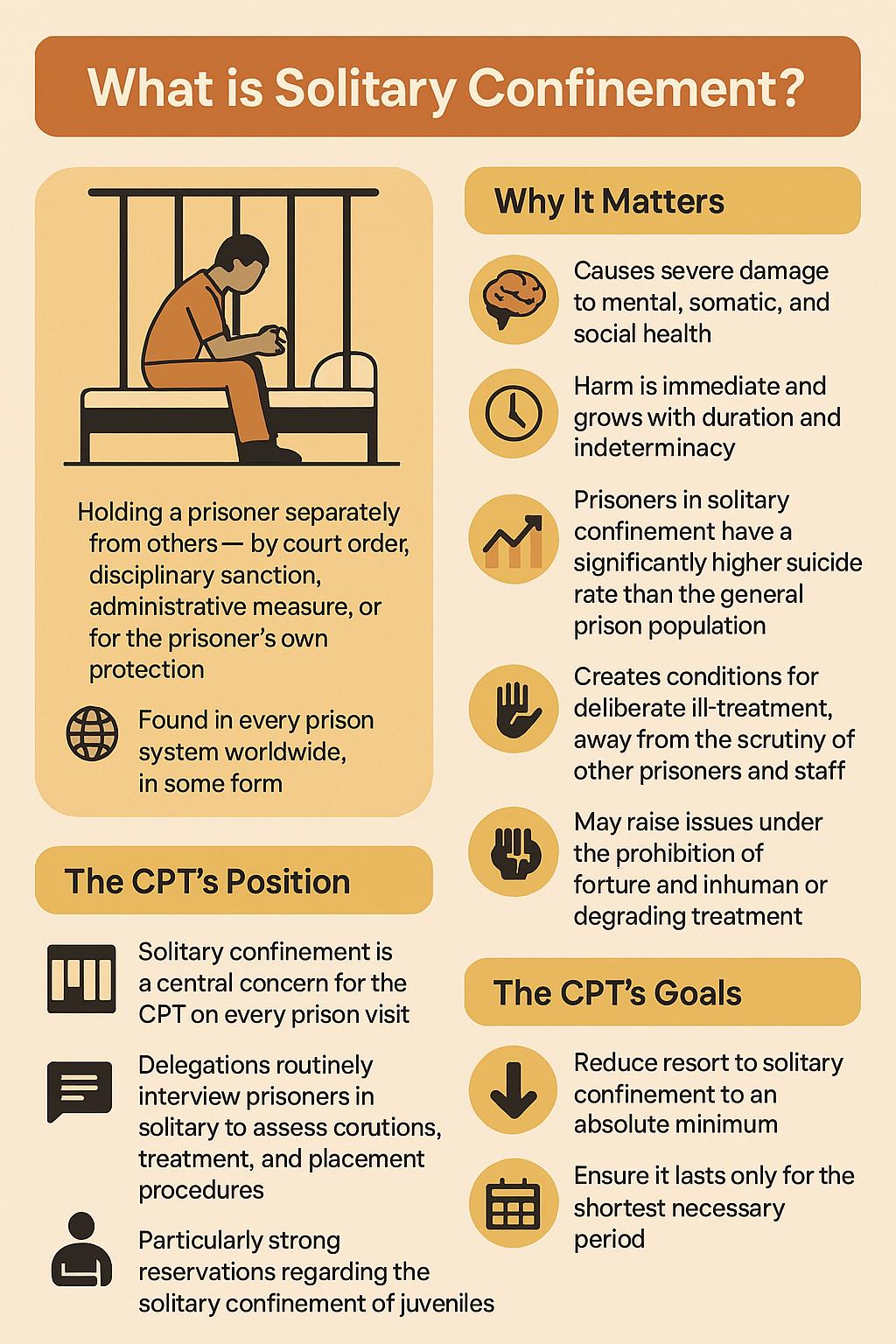 Цей шкідливий вплив може бути негайним і посилюється, чим довше триває така міра і чим більш невизначеним є її термін. Найбільш значущим показником шкоди, яку може завдати одиночне ув’язнення, є значно вищий рівень самогубств серед ув’язнених, які його зазнають, порівняно з загальною популяцією ув’язнених. Отже, очевидно, що одиночне ув’язнення саме по собі потенційно порушує питання щодо заборони катувань та нелюдського або принижуючого гідність поводження чи покарання. Крім того, воно може створити можливість для навмисного жорстокого поводження з ув’язненими, поза увагою інших ув’язнених та персоналу. Відповідно, це є центральним питанням для ЄКЗК, і під час кожного візиту делегації обов’язково проводять бесіди з ув’язненими, які перебувають в одиночному ув’язненні, щоб перевірити їхні умови утримання та поводження, а також процедури прийняття рішень щодо такого розміщення та їх перегляду.