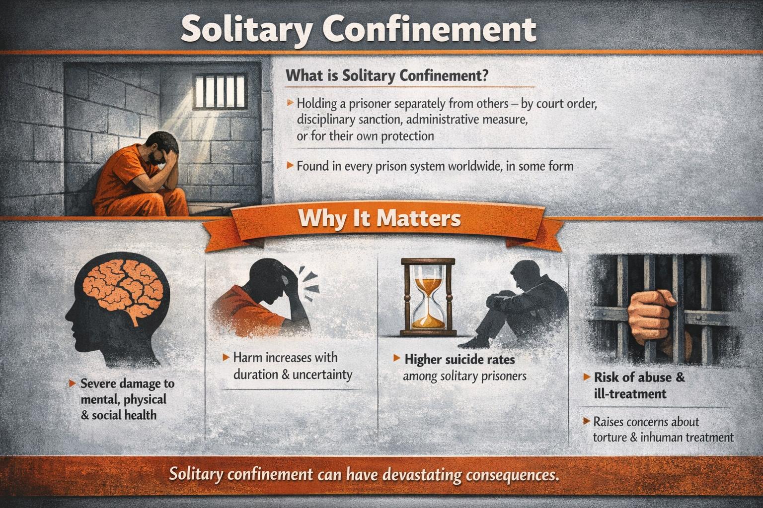 Цей шкідливий вплив може бути негайним і посилюється, чим довше триває така міра і чим більш невизначеним є її термін. Найбільш значущим показником шкоди, яку може завдати одиночне ув’язнення, є значно вищий рівень самогубств серед ув’язнених, які його зазнають, порівняно з загальною популяцією ув’язнених. Отже, очевидно, що одиночне ув’язнення саме по собі потенційно порушує питання щодо заборони катувань та нелюдського або принижуючого гідність поводження чи покарання. Крім того, воно може створити можливість для навмисного жорстокого поводження з ув’язненими, поза увагою інших ув’язнених та персоналу. Відповідно, це є центральним питанням для ЄКЗК, і під час кожного візиту делегації обов’язково проводять бесіди з ув’язненими, які перебувають в одиночному ув’язненні, щоб перевірити їхні умови утримання та поводження, а також процедури прийняття рішень щодо такого розміщення та їх перегляду.