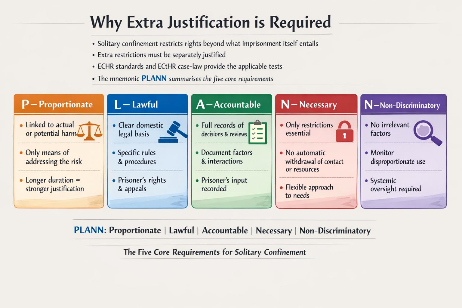 - Закон повинен визначати: 1) точні обставини застосування; 2) уповноважених осіб, що приймають рішення; 3) процедури, яких слід дотримуватися; 4) право ув’язненого на подання зауважень; 5) обов’язок надавати якомога повніші обґрунтування (за винятком обмежених випадків, пов’язаних із безпекою); 6) частоту та процедуру перегляду; 7) процедури оскарження